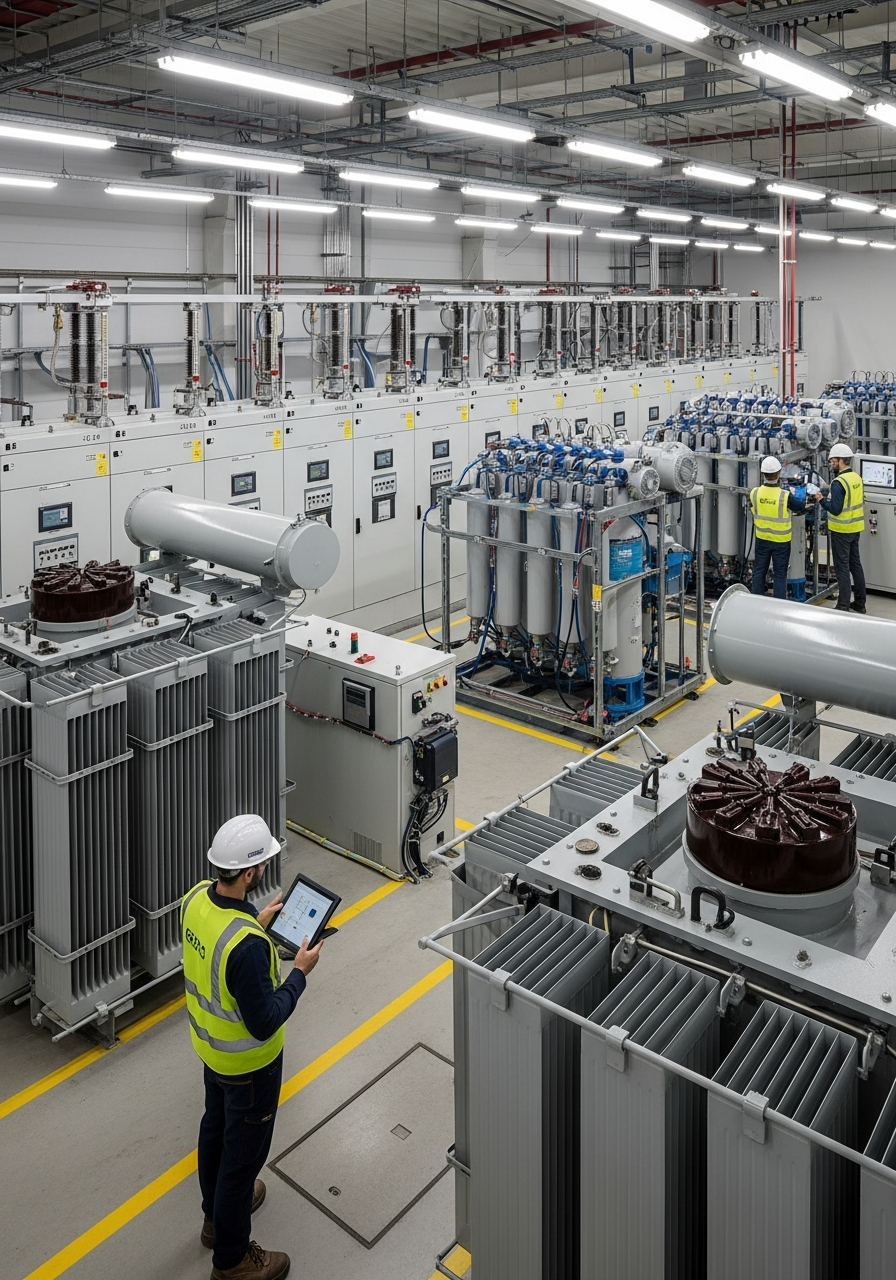Energy-efficient distribution and power transformers with OLTC for stable voltage regulation.